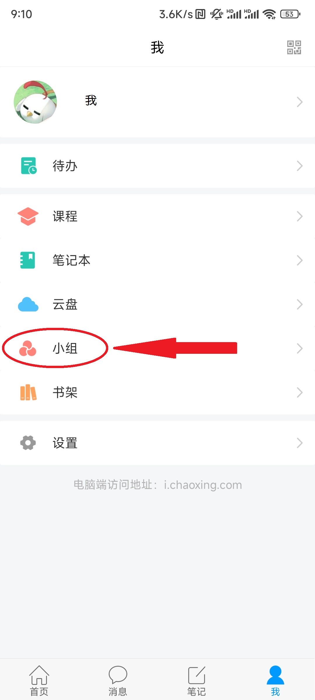 ①打开学习通,点击“我”,然后点击“小组”。